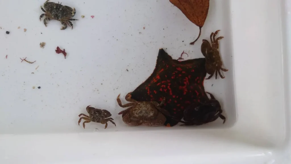 カニやヤドカリはもちろん、小さなエビや魚、ヒトデなど、たくさんの生物を捕まえては、じっくりと観察を楽しみました。中には、勇気を出して海に入り、シュノーケルを使って生き生きと泳ぐ魚たちを観察する生徒もいました。