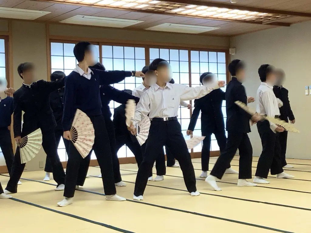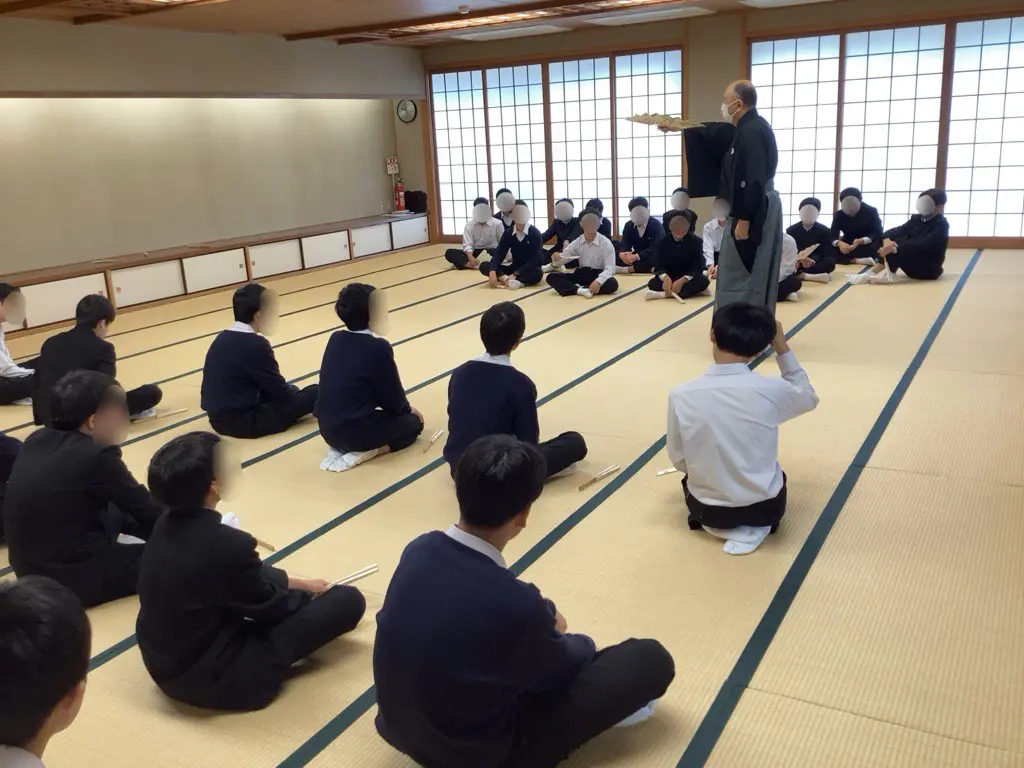 中学2年男子を対象とした特別授業「能楽教室」は、いよいよ終盤を迎えております。本日は、作法室にて能楽師・高橋忍先生のご指導のもと、ついに舞の所作を最後まで習い終えました!