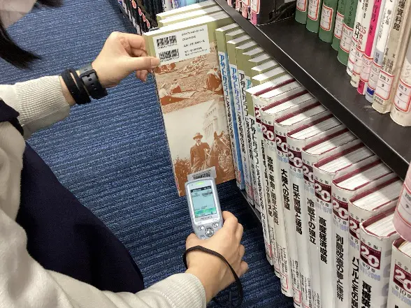図書館の点検とは、図書館にあるすべての本のバーコードを1冊、1冊よみとって、データと合っているかを確認する作業です。