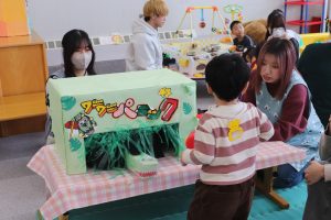 子育てサロン「ありす」は、お父さん、お母さん、お子さんのための広場で、月に1回、本学プレイルームにて開催しています。スタッフは本学を卒業した保育士の他、幼児・児童教育学科 幼児保育コースの学生が授業の一環で参加し、読み聞かせや手遊びを担当しています。