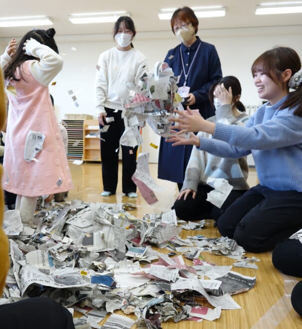 今回は、子ども支援学科の塩谷香先生が講師となり、支援学生の会(愛称:ち−へる)のメンバーを中心に、おうちでできる親子遊びを計画しました。親子遊びは、前半にふれあい手遊び、後半に新聞紙遊びを行い、親子と学生とが交流しながら楽しい時間を過ごしました。