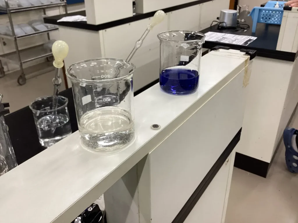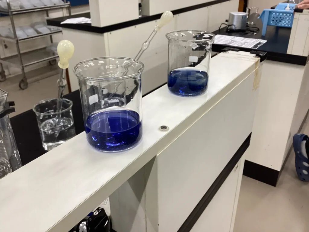 この実験の驚くべき点は、一度混ぜ合わせた水溶液が「無色」と「青紫色」を一定の周期で交互に繰り返すことです。透明だった液体が、ある瞬間パッと深い青色に変わり、数秒後にはまた魔法のように消えていく……。この神秘的なサイクルが目の前で始まると、部員たちからは「おぉ、すごい!」「本当に動いているみたいだ!」と大きな歓声が上がりました。
