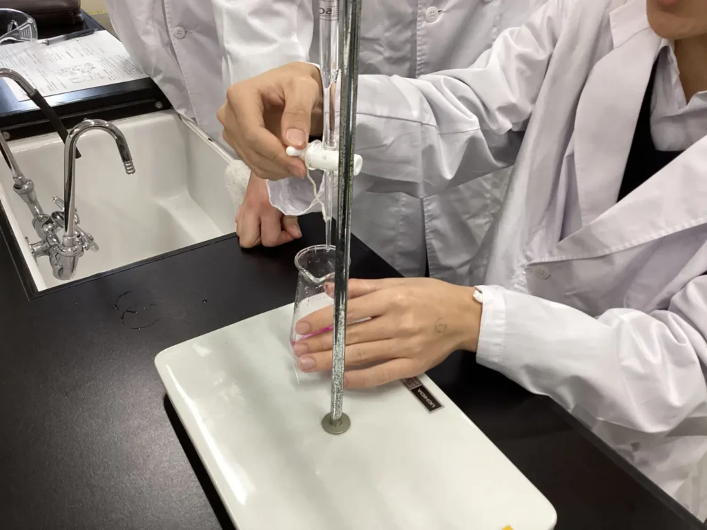 今回の目標は、フェノールフタレイン溶液を加えた水溶液が、ほんのりと「薄い紫色(薄いピンク色)」に色づいたまま消えない状態=中和点を見つけ出すこと。生徒たちはビュレットのコックを慎重に操り、一滴、また一滴と溶液を落としていきます。