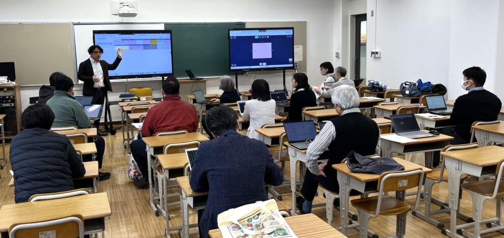 3/13(金)10:00よりICT教室において、ICT教材活用に関する自主研修会が開かれました。3学科の教員15名が参加し、講師は初等教育学科の寺本貴啓先生が務めました。学校現場で導入されている「ロイロノート」の基本操作や、大学の授業での管理方法などを、生徒の立場と教員の立場から実際に操作しながら体験しました。また、新しく導入されたオールインワンの電子黒板の使用方法も併せて学習していました。2時間を超える研修会でしたが、先生方はお互いに教えながら熱心に取り組んでいました。