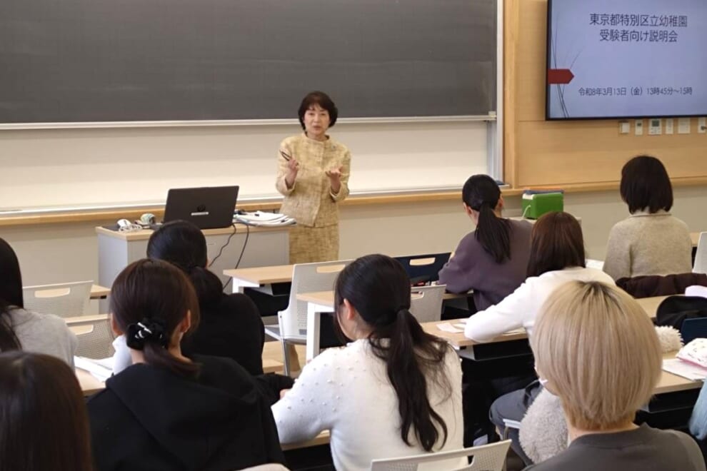 3/13(金)13:45から1407教室において、教職顧問の林先生による特別区幼稚園ガイダンスが行われました。特別区の幼稚園の動向や採用試験の詳細な傾向について資料を基に詳しく説明されていました。1年生から3年生の学生が参加し、過去問題に目を通しながら、熱心に試験対策についてメモを取っていました。