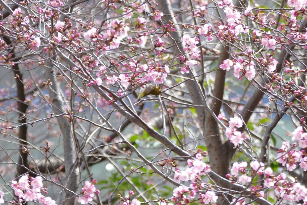 中庭の桜が開花しました。鳥たちがさっそく蜜を吸いに来ています。今週末の卒業式には卒業生を華やかに迎えてくれることでしょう。