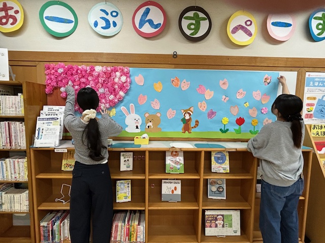Weekly通信12/3号、2/18号でお伝えしてきました山内図書館の絵本コーナーが、4月の装飾に展示替えされました。子ども支援学科「色彩とデザイン」(担当:島田由紀子先生)の授業で制作した壁面装飾と、國學院幼稚園の子どもたちが描いた絵を組み合わせた壁面装飾を島田ゼミの学生が行いました。授業では、学生たちが色彩や構図、素材の扱い方を意識しつつ、園児が参加できる壁面デザインを考える活動に取り組んでいます。春らしい壁面の主役は、山内図書館キャラクターの「やまちゃん」(レッサーパンダの4才の男の子)です。
